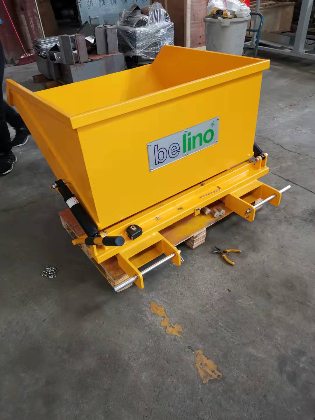 The release mechanism is activated by the forklift operator pulling the draw rope the driver's seat. The custom-built shock absorber prevents impact forces being transmitted to the forklift during emptying.